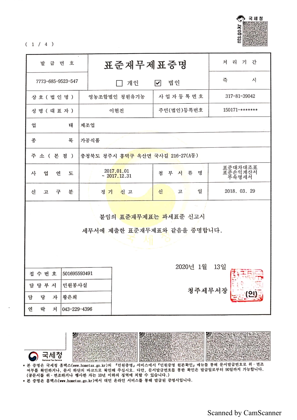 [영농조합법인 청원유기농] 2017년도